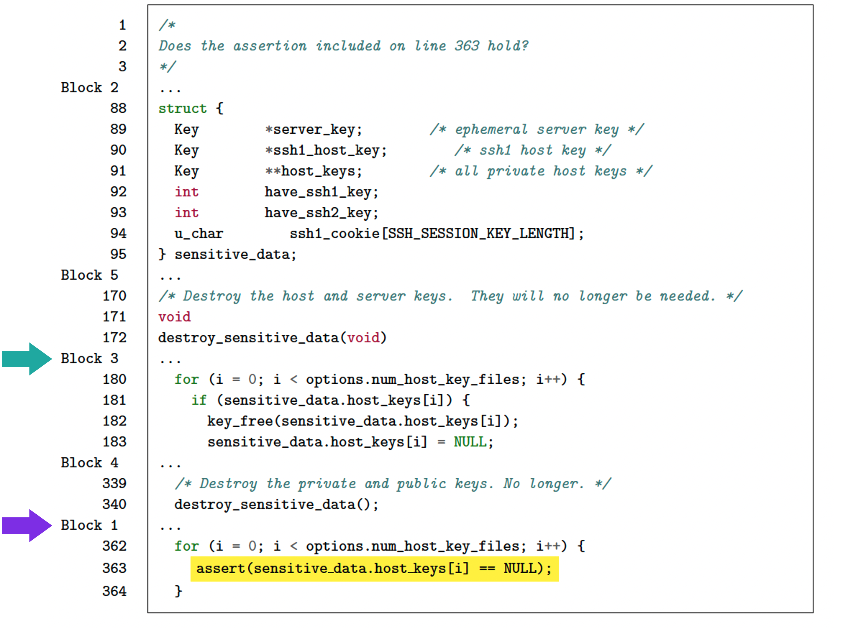 The Alpscarf shows that all participants fixated on the relevant parts of the code, especially Block 3 that contains the assignment of the variable under assertion in Block 1. They also kept revisiting Block 1 to check the assertion.